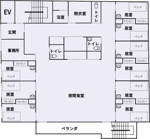 | 共有設備 | 食堂・談話室・浴室・トイレ・洗面所・面談室・洗濯室・エレベーター |